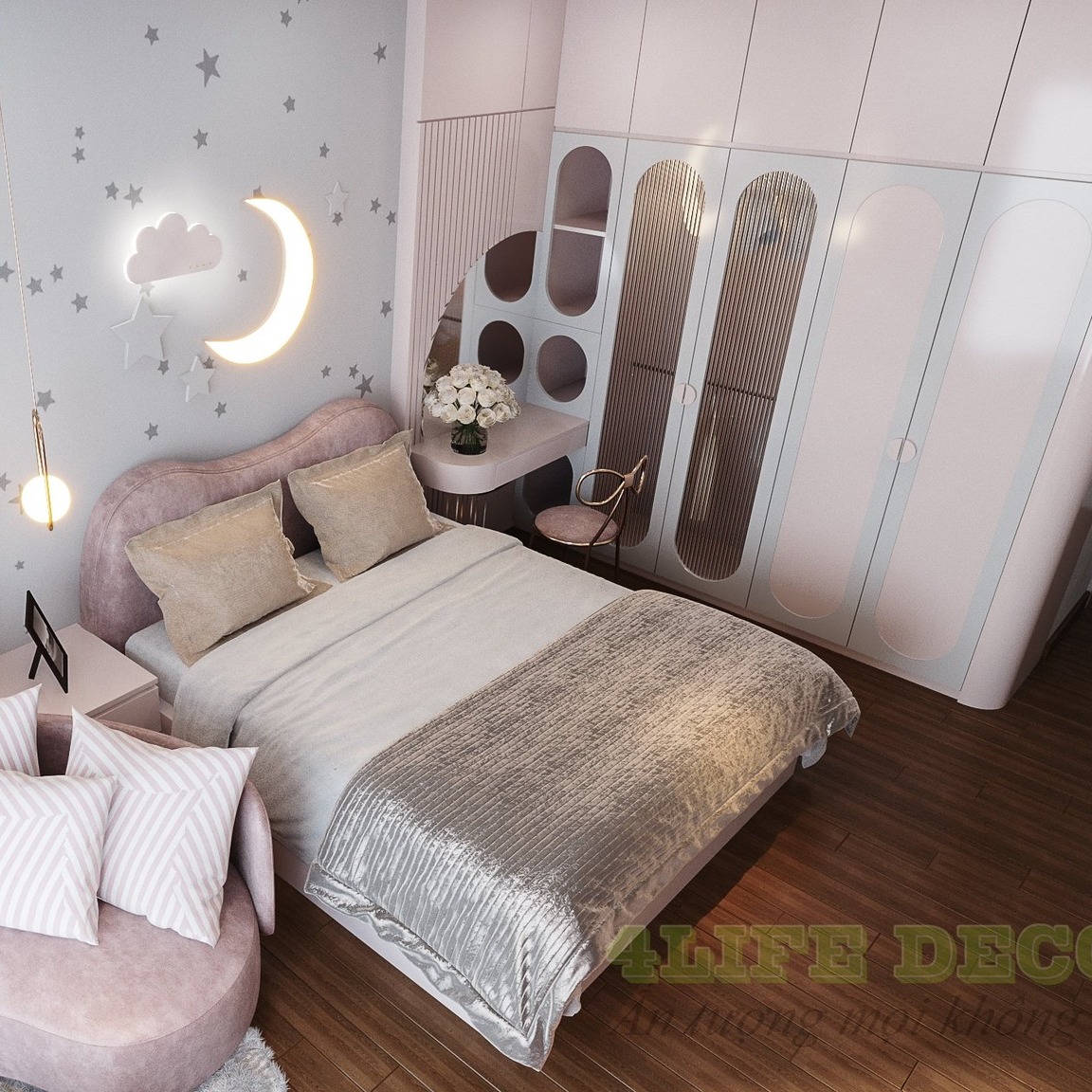 Tủ áo đẹp WD050 được thiết kế theo kiểu dáng bo cong mềm mại, độc đáo cùng tông màu hồng xinh xắn, bắt mắt.