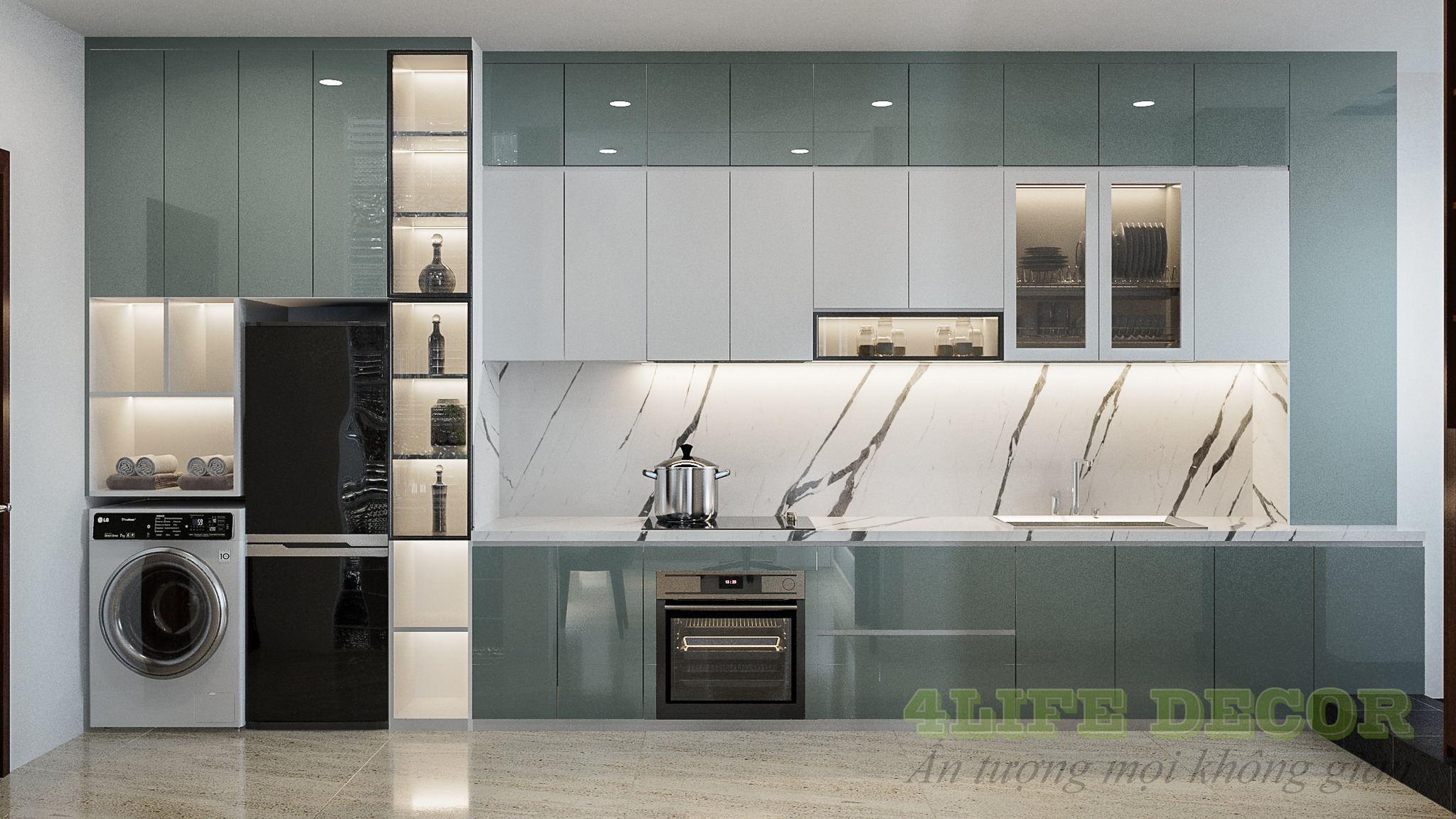 - Mang đến hiệu ứng sáng bóng đầy sang trọng: Lớp phủ Acrylic có độ bóng gương cao, giúp phản chiếu ánh sáng, mang đến cảm giác rộng rãi và sang trọng cho không gian bếp.