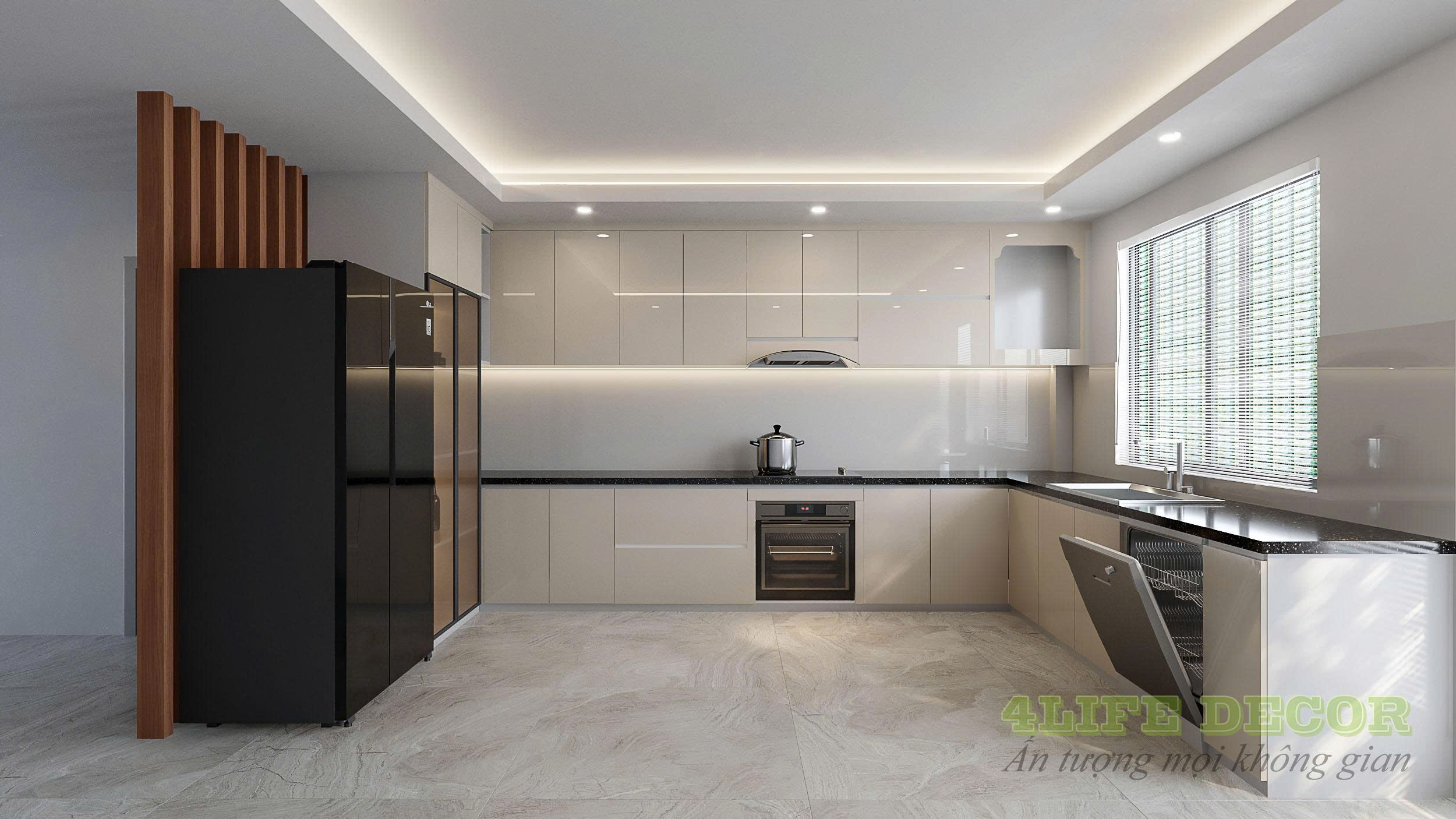 Bề mặt bóng gương sang trọng: Phủ Acrylic An Cường cao cấp cho độ bóng hoàn hảo như gương, nâng tầm đẳng cấp không gian bếp
